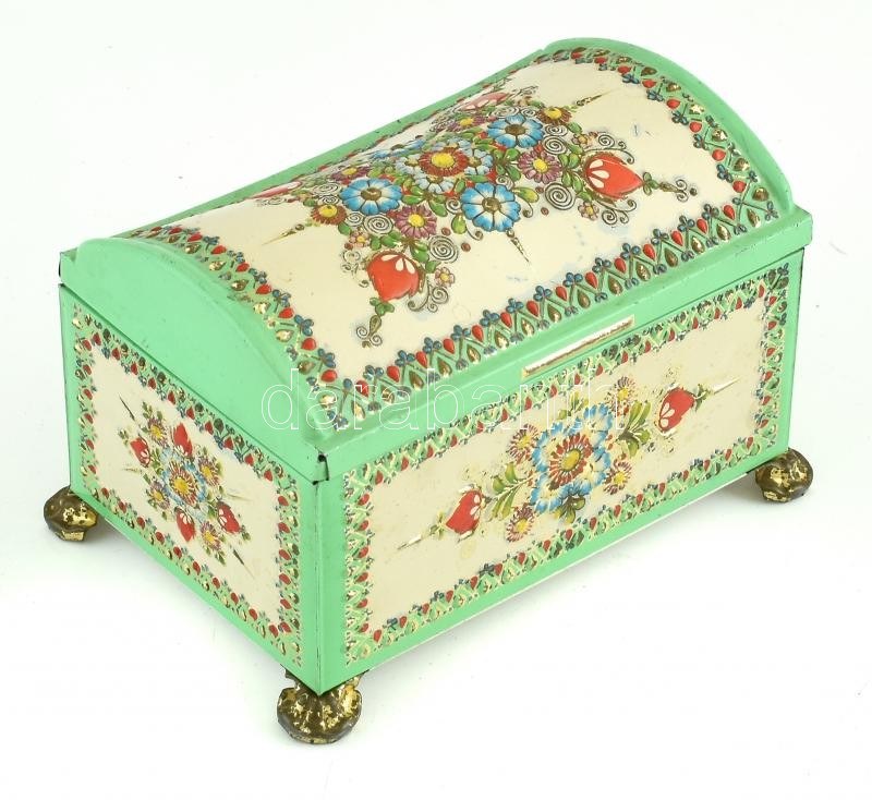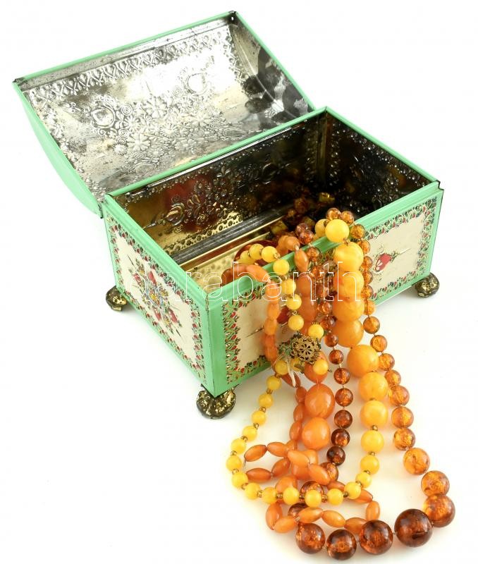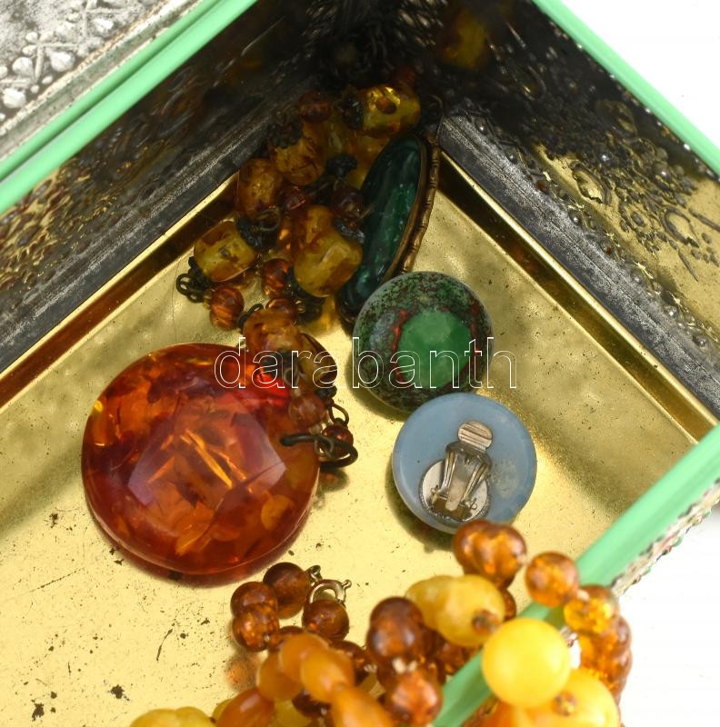 Description: Vegyes bizsu tétel, 4 nyaklánc, közte borostyán-szerű, fülbevaló pár, régi brossal, különféle méretben, változó állapotban, kopott díszes fém dobozban, 16x10x8 cm