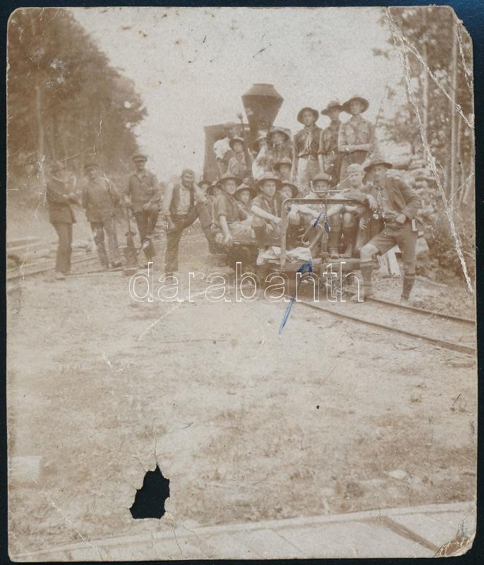 cca 1910-1920 Cserkészek kisvasúton, vágott fotó, lyukkal, sérülésekke...