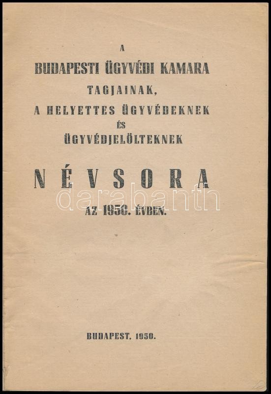Description: A Budapesti Ügyvédi Kamara tagjainak, a helyettes ügyvédeknek és ügyvédjelölteknek névsora az 1950. évben. Bp., 1950, Budapesti Ügyvédi Kamara, 86 p. Kiadói papírkötés, kissé sérült borítóval, helyenként kissé sérült lapokkal, ceruzás firkával.