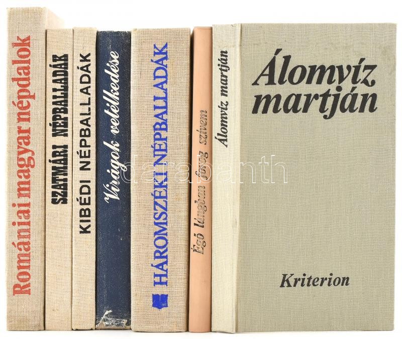 Description: 7 db erdélyi magyar népdalok, népballadák témájú, a Kriterion és Dacia kiadónál megjelent könyv: Szatmári népballadák. + Kibédi népballadák. + Virágok vetélkedése. Régi magyar népballadák. + Háromszéki népballadák. + Romániai magyar népdalok. + Égő lángban forog szívem. + Álomvíz martján. Különböző kiadások, vegyes állapotban.