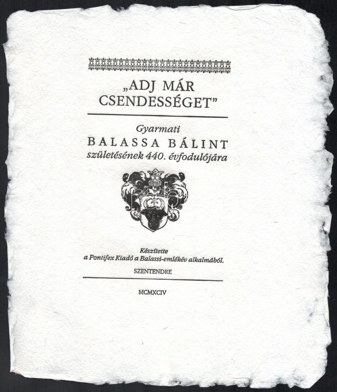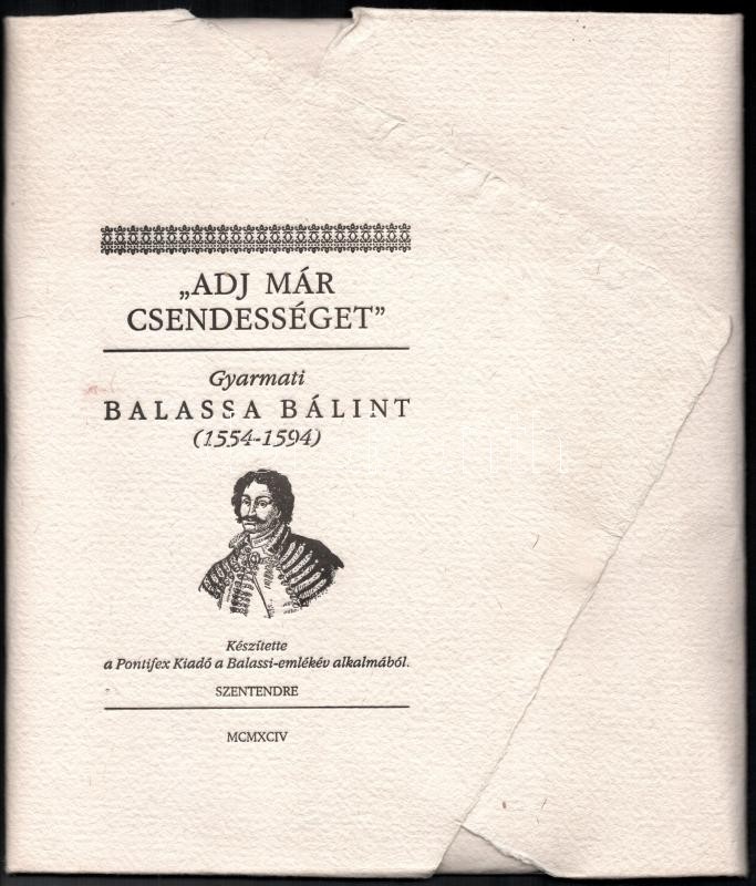 "Adj már csendességet". Gyarmati Balassa Bálint (1554-1594).... https://www.darabanth.com/en/407-Online-auction/407.0/Books/Books-Other-rarities~2000021/Adj-mar-csendesseget-Gyarmati-Balassa-Balint-1554-1594-Szentendre-1994-Pontifex-Kiado-K~II2519619
