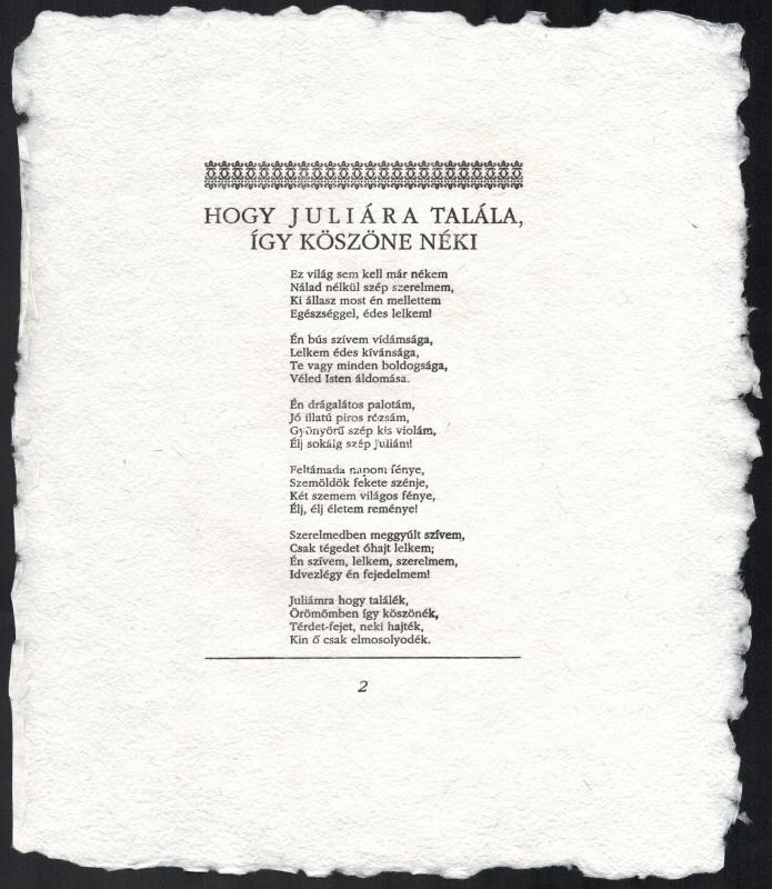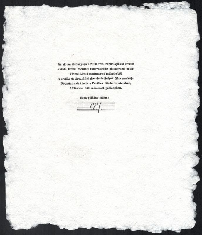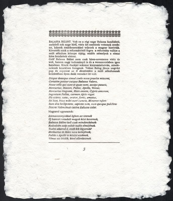 Description: "Adj már csendességet". Gyarmati Balassa Bálint (1554-1594). Szentendre, 1994, Pontifex Kiadó. Készült 300 számozott példányban (300/127), Vincze László Műhelxében. 10p. Kiadói merített papírtokban, minden egyes lap merített papír, fűzés nélkül.
