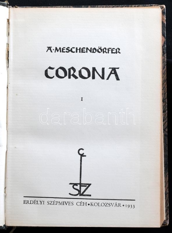 Description: A[dolf] Meschendörfer: Corona. I. kötet. (Fordította: Kós Károly, a szövegközti verseket Dsida Jenő fordította. Kolozsvár, 1933., Erdélyi Szépmíves Céh, 194+2+IV p. Kiadói félbőr-kötés, kopott borítóval, a gerincen sérüléssel, az elülső kötéstáblán kis ütődéssel. 178. számú számozott példány.