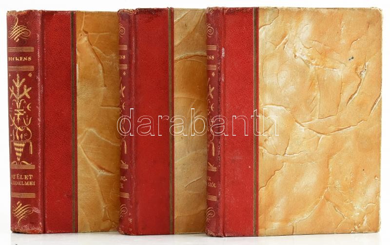 Description: Charles Dickens 3 műve: Dickens Károly: Akinek tücsök szól a tüzhelyén... Ford.: Benedek Marcell. + A harangjáték. Ford.: Balla Mihály. + Az élet küzdelmei. Ford.: Benedek Marcell. Bp., é.n., Dante. Aranyozott gerincű félbőr-kötés, kissé sérült, kopott borítóval, helyenként kissé sérült lapokkal.