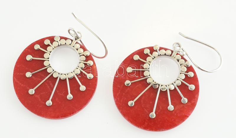 Ezüst(Ag) fülbevalópár korall díszítéssel, jelzés nélkül, d: 3 cm, bruttó: 5,7 g