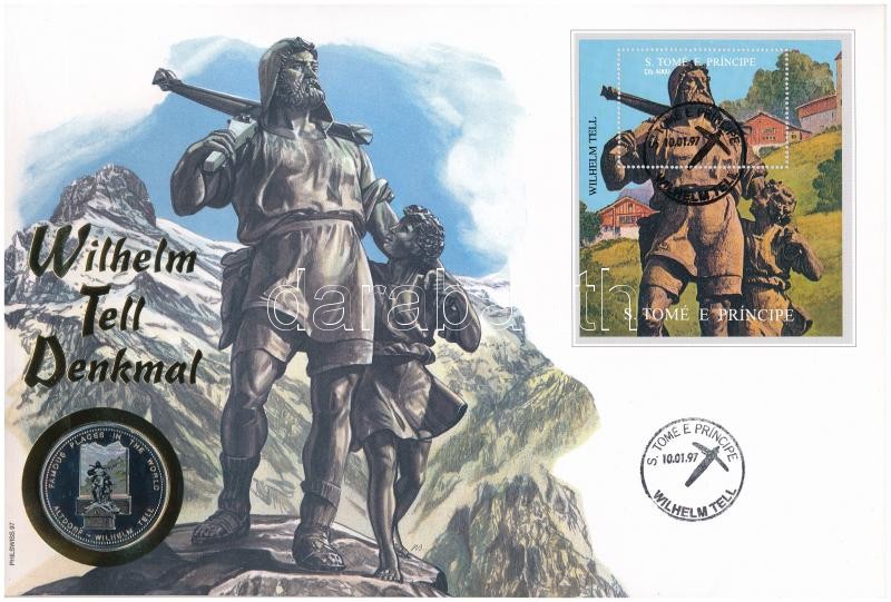 Description: Uganda 1996. 1000Sch Cu-Ni "Tell Vilmos" multicolor, érmés borítékban, Sao Tomé és Principé bélyeggel, bélyegzéssel, német nyelvű leírással T:PP Uganda 1996. 1000 Schilling Cu-Ni "Wilhelm Tell" multicolor, in coin envelope with stamp and cancellation, with German language description sheet C:PP