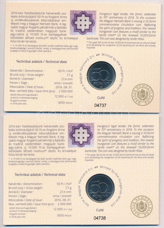 2016. 50Ft Cu-Ni "70 éves a forint" első napi veret sorszámozott emléklapon (2x) sorszámkövetők "04737 - 04738" sorszámmal T:1