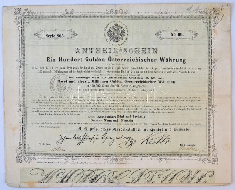 Ausztria / Bécs 1858. "K.K. Österrechische Credit-Anstalt für Handel u... https://www.darabanth.com/en/407-Online-auction/407.0/Numismatics/Shares-and-Tickets~1500006/Ausztria-Becs-1858-KK-Osterrechische-Credit-Anstalt-fur-Handel-und-Gewerbe-reszvenye-100~II2518246