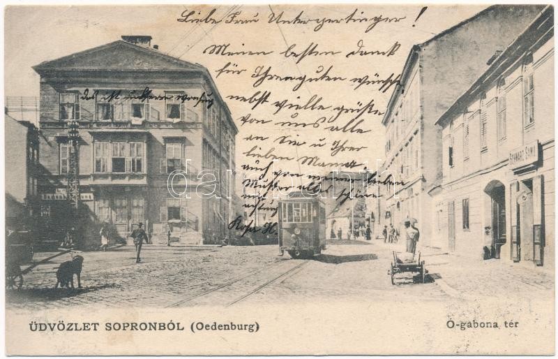 1904 Sopron, Ó-gabona tér, villamos, Schwarz Samu üzlete (EK)