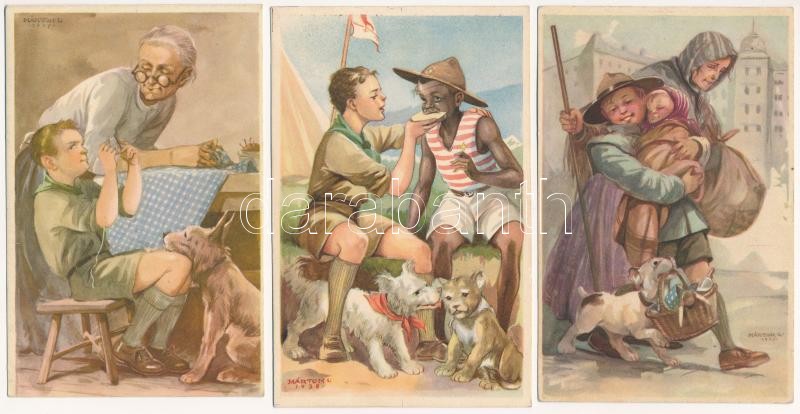 3 db RÉGI Cserkész Levelezőlapok Kiadóhivatal cserkész motívumlap, Márton L. szignóval / 3 pre-1945 Hungarian scout art postcards, signed by Márton L.