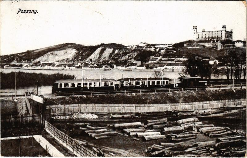 1918 Pozsony, Pressburg, Bratislava; Elektrische Bahn (Pressburger Bahn) / Pozsony-Bécs villamos vasút, vonat, vár / hotel, tram, Bratislava-Wien urban railway, locomotive (EK)