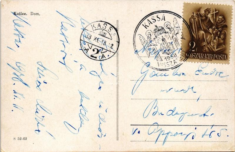 1938 Kassa, Kosice; Dom / székesegyház, villamos / cathedral, tram + "1938 Kassa visszatért" So. Stpl.