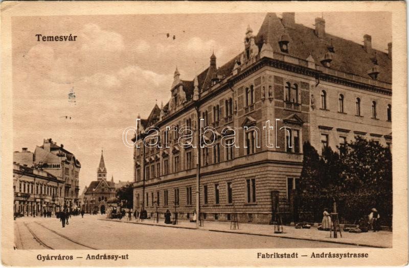 1918 Temesvár, Timisoara; Gyárváros, Andrássy út / Fabric, street, bank (EK)