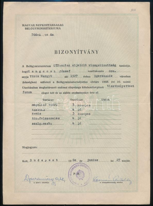 1960 Bp., Magyar Népköztársaság Belügyminisztériuma által kiállított bizonyítvány tiszthelyettes részére
