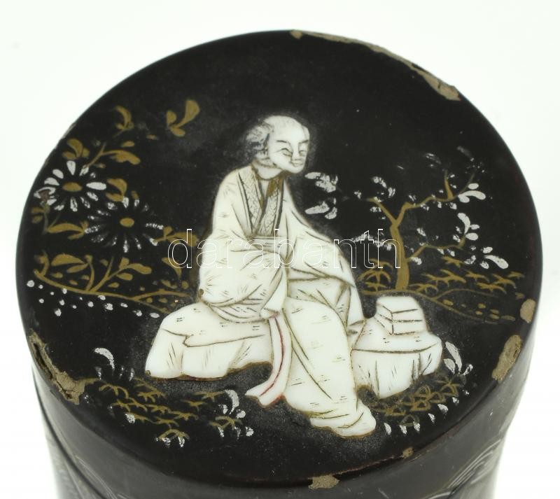Japán lakk doboz, erősen sérült, javításra, restaurálásra szorul. m: 8,5 cm