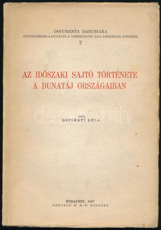 Description: Dezsényi Béla: Az időszaki sajtó története a Dunatáj országaiban. Documenta Danubiana 2. Értekezések a dunai és a nemzetközi jogi kérdések köréből. Bp., 1947., Gergely Rt., 71 p. Kiadói papírkötés, kissé foltos borítóval, aláhúzásokkal.