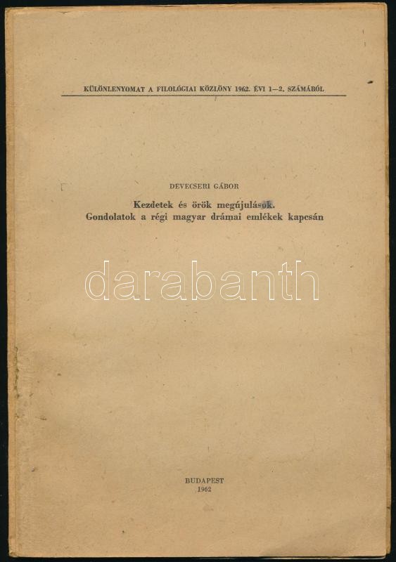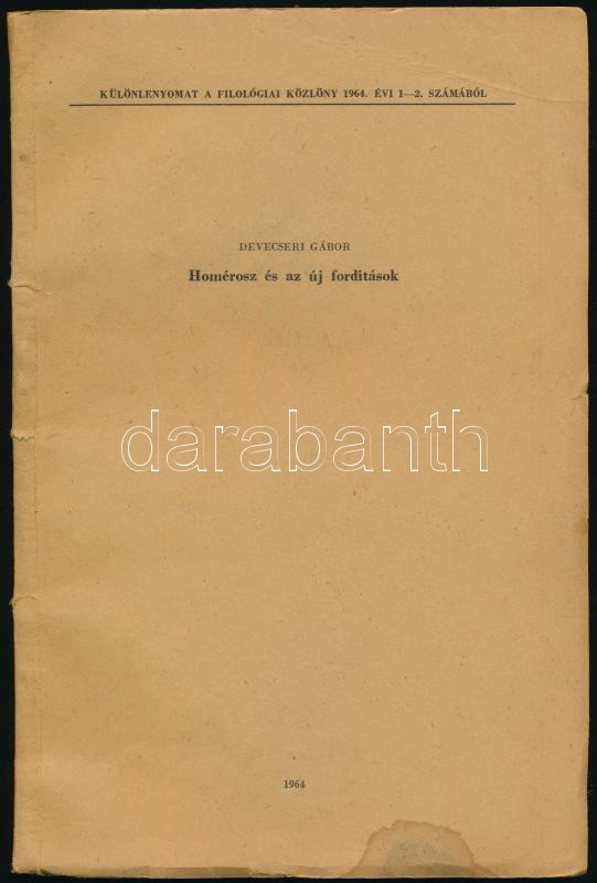 1964 Devecseri Gábor: Homérosz és az új fordítások. Különlenyomat a Filológiai Közlöny 1964. évi 1-2. számából, 46p, Kezdetek és örök megújulások. Gondolatok a régi magyar drámai emlékek kapcsán. ; Mégegyszer a Homérosz-fordtásokról