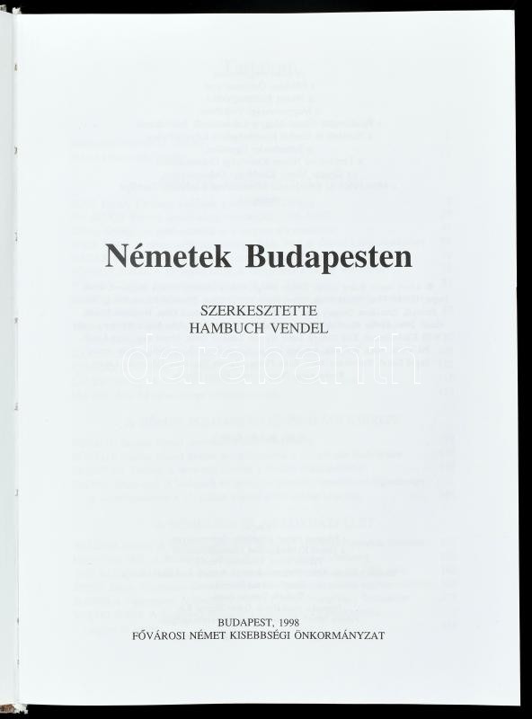 Németek Budapesten. Szerk.: Hambuch Vendel. Bp., 1998, Fővárosi Német Kisebbségi Önkormányzat. Fekete-fehér képanyaggal illusztrált. Kiadói kartonált papírkötés. Számos fekete-fehér képpel illusztrálva. Kiadói kartonált papírkötés, a gerincnél sérült borítóval. Melléklettel. (Rédey Judit: Németek a főváros vendéglátásában és kereskedelmében. Bp., 1998, Német Kultúregyesület, 19 p. Tűzött papírkötés.)