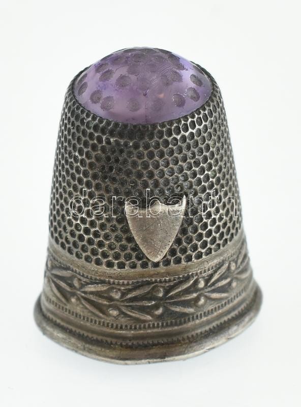 Ezüst (Ag) gyűszű, kék üveggel ékítve, horpadt, kopott, jelzett, brutt...