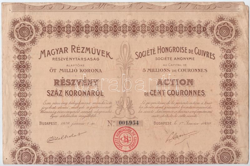 Budapest 1909. "Magyar Rézművek Részvénytársaság" részvénye magyar és ...
