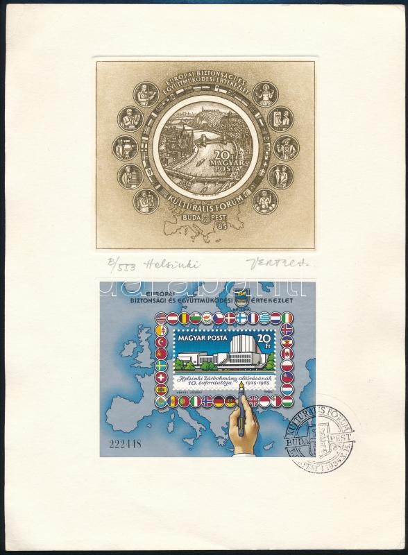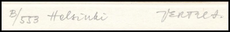 Vertel József (1922-1993): Helsinki EBESZ. Rézkarc, papír, jelzett, sorszámozott B/553 rajta a tervezett blokkal. 8x9,5 cm