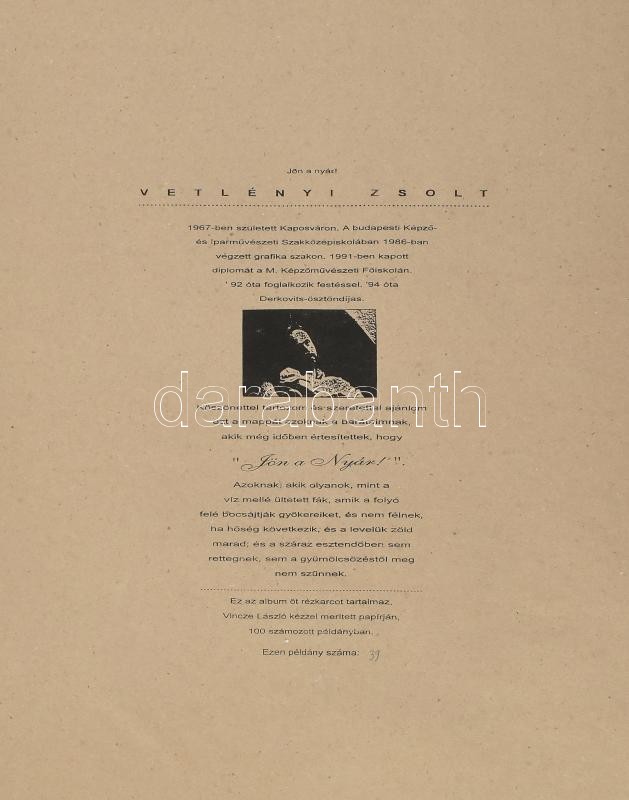 Vetlényi Zsolt (1967-): "Jön a nyár" c. album, 5 db grafikával külön lapokon. Rézkarc, merÃtett papÃr, mindegyik jelzett és számozott: 39/100. Kiadói mappában, teljes. 7,5x7,5 és 19,5×22,5 cm közötti méretben.
