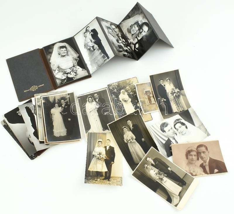 24 db vegyes, régi és modern esküvői fotó + Fővárosi Fotó Vállalat leporelló fényképalbum, benne 8 db esküvői fotóval