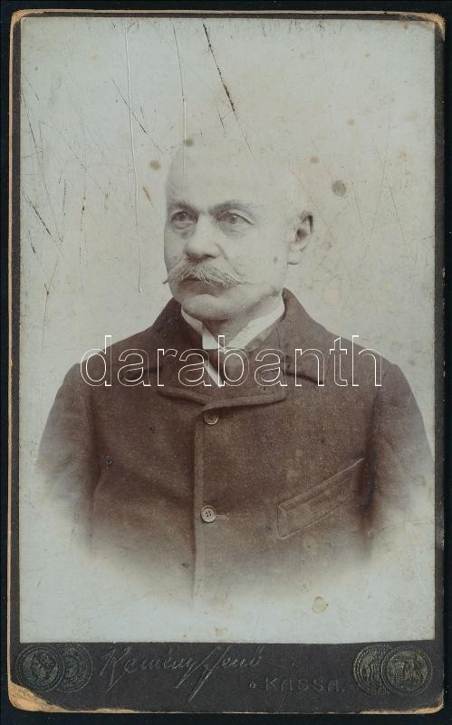 cca 1905 Férfi portréja, keményhátú fotó Kemény Jenő kassai műterméből, kissé foltos, karcos, 6x9,5 cm