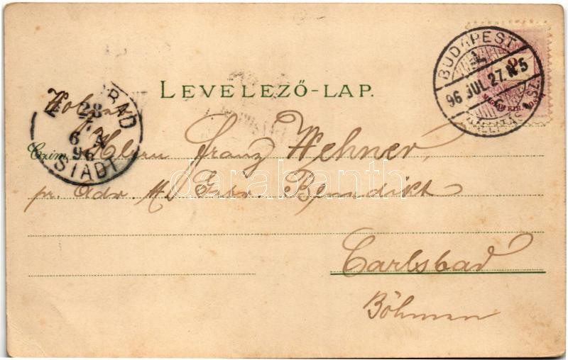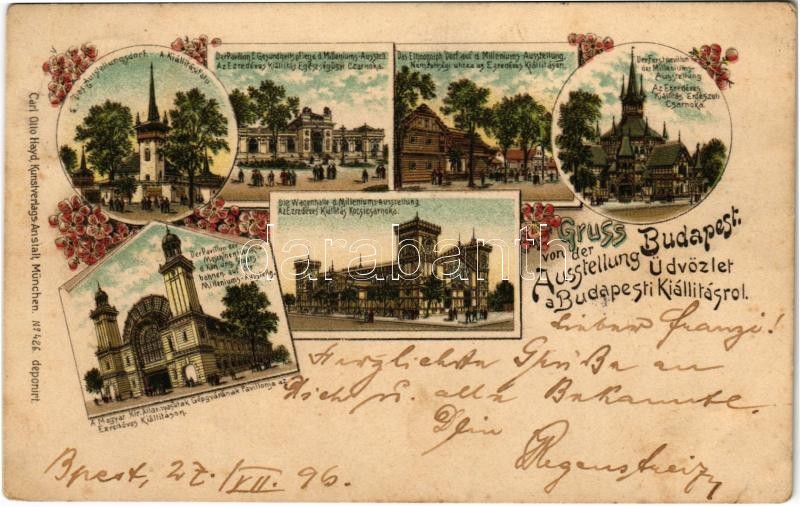 Description: 1896 (Vorläufer!!!) Budapest XIV. Az Ezredéves Kiállítás kocsicsarnoka, Kiállítási falu, Egészségügyi csarnok, Nemzetiségi utca, Erdészeti csarnok, Magyar Kir. Államvasutak (MÁV) Gépgyárának pavilonja. Carl Otto Hayd Kunstverlags-Anstalt No. 426. Art Nouveau, floral, litho