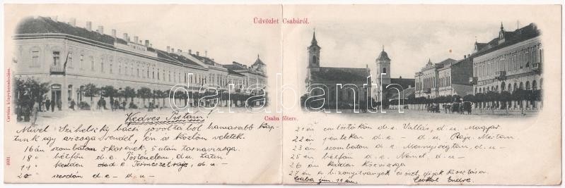 1900 Békéscsaba, Csaba; Fő tér, Fiume szálloda, üzletek. Corvina könyvkereskedés kiadása. kihajtható panorámalap