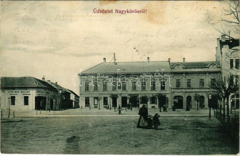 1909 Nagykőrös, Népbank, Központi szálloda, Izsó Imre Magyar vendéglője, üzletek. Geszner J. kiadása (r)