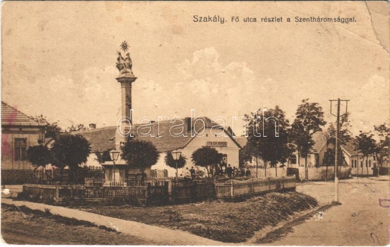 1936 Szakály, Fő utca, Szentháromság szobor, Hangya üzlete. Neuvelt La...