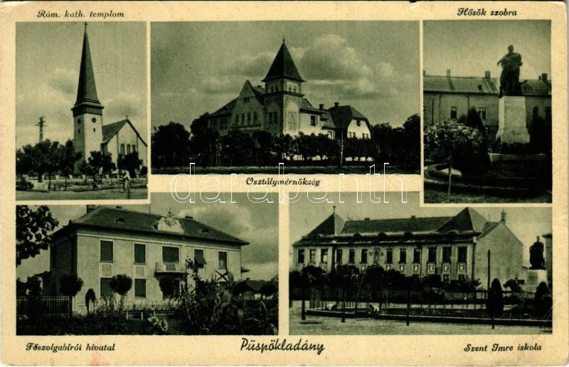 1940 Püspökladány, Római katolikus templom, Osztálymérnökség, Hősök szobra, emlékmű, Főszolgabírói hivatal, Szent Imre iskola (EB)