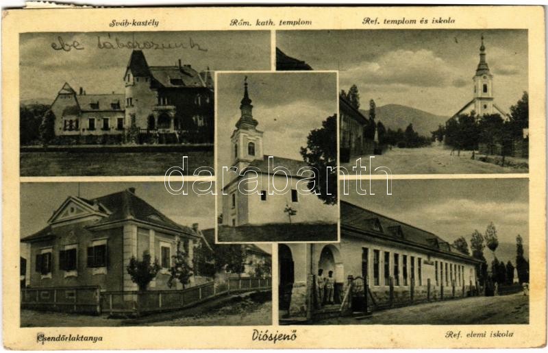1949 Diósjenő, Sváb kastély, Római katolikus templom, Református templom és iskola, Csendőrlaktanya, Református elemi iskola. Wéber Gyula kiadása (EK)