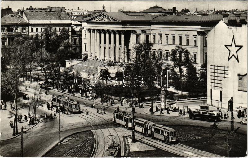 1956 Budapest VIII. Nemzeti Múzeum tetején Vörös Csillaggal, Kálvin tér, villamosok, autóbusz, Singer ház a háttérben. Képzőművészeti Alap (EK)