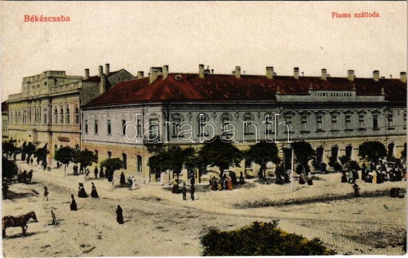 Békéscsaba, Fiume szálloda, piac. Vasúti levelezőlapárusítás 2. 1918.