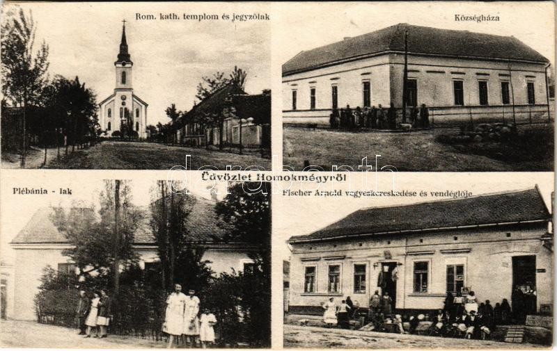 Homokmégy (Kalocsa), Római katolikus templom, jegyzőlak, plébánia lak, községháza, Fischer Arnold vegyeskereskedése és vendéglője (r)