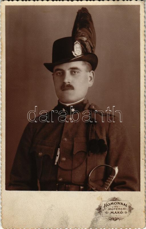 https://www.darabanth.com/en/408-Online-auction/408.0/Postcards/Hungary~1500005/Mako-magyar-csendor-kakastollas-kalapban-magyar-cimerrel-es-karddal-Homonnai-muterem-photo~II2526633