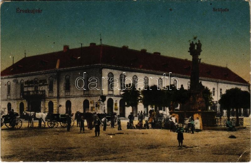 Érsekújvár, Nové Zámky; szálloda, Szentháromság szobor. Vasúti levelezőlapárusítás 20-1918. / hotel, Trinity statue (EK)