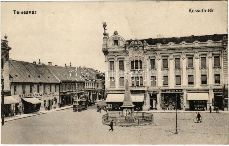 Temesvár, Timisoara; Kossuth tér, szobor, villamos, Marokkaner szálloda, Nenadovits, Schill Károly, Grosz Lajos, Bleier M., Schneider János üzlete / square, tram, shops, monument, hotel (EB)