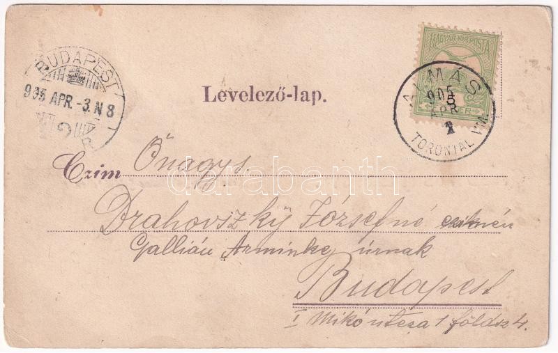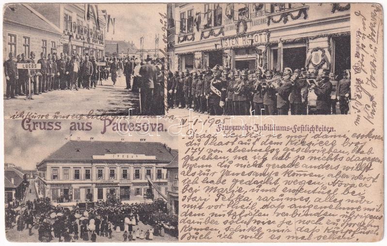 1905 Pancsova, Pancevo; Feuerwehr-Jubiläums-Festlichkeiten / Tűzoltóság jubileumi ünnepsége, Tűzoltólaktanya "Isten hozott" felirattal és zenekarral, tűzoltók Lugosról, Grand Hotel Trompeter szálloda, Herman Adler, Marcus May üzlete / fire brigade anniversary celebrations, firefighter barracks, firefighters from Lugoj, hotel, shops (EK)