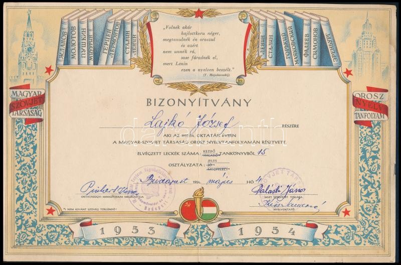 https://www.darabanth.com/en/409-Online-auction/409.0/Art-and-other-collectibles/Documents~500018/1954-Szocreal-orosz-nyelvtanfolyami-oklevel-grafikus-diszitessel~II2537381
