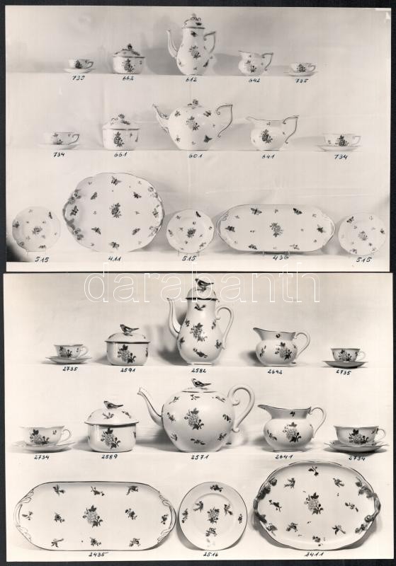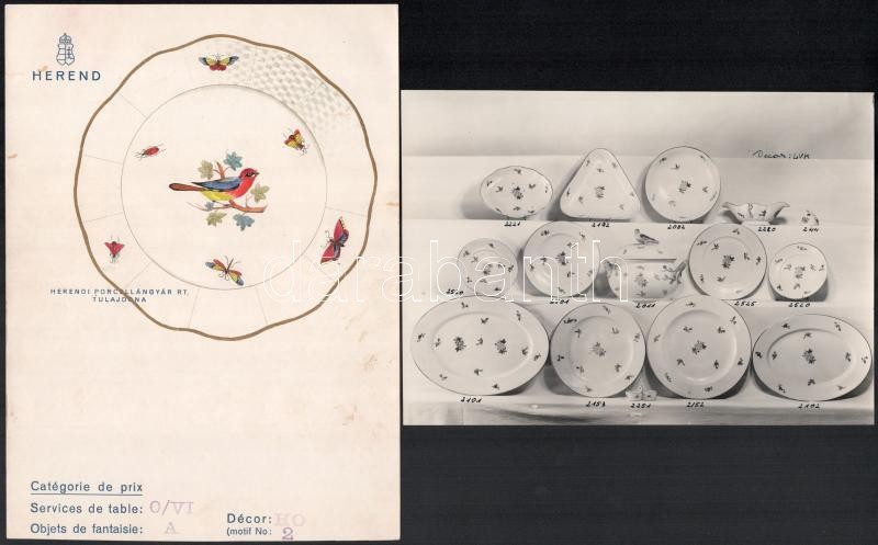 Description: 1938 A "fonott" modell kontúrrajzai. A Herendi Porcelángyár centenáriumi (1839-1939) katalógusa. 38 p., ceruzás bejegyzésekkel + 5 db Herendi porcelán termékeket bemutató, színes tábla, 27x19 cm + 3 db fekete-fehér fotó, 23x16 cm