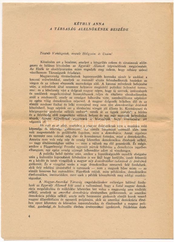 1945 A Magyar-Amerikai Társaság alakuló közgyűlésén elhangzott beszédek közte Kéthly Anna, felvágatlan 8 p.
