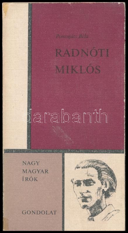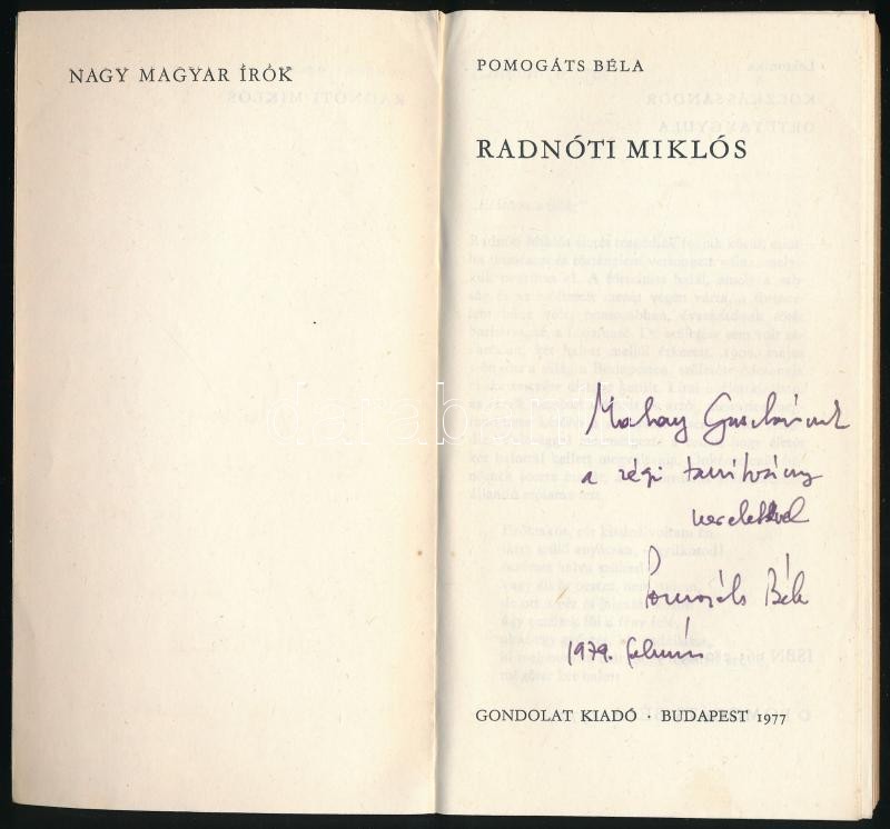 Pomogáts Béla: Radnóti Miklós. Nagy magyar írók. Bp., 1977., Gondolat. Kiadói kissé kopott papírkötés, a gerincen kis szakadással. A szerző, Pomogáts Béla (1934-) Széchenyi-díjas kritikus, tanár, irodalomtörténész által Makay Gusztáv (1910-1984) irodalomtörténész, kritikus, egyetemi tanár részére dedikált példány.
