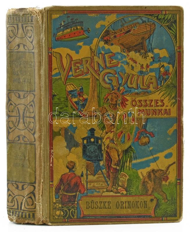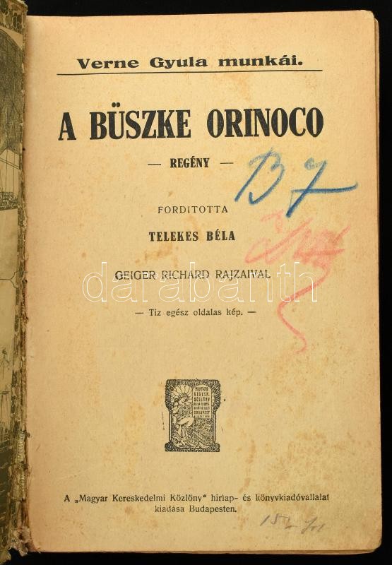 Verne Gyula: A büszke Orinoco. Regény. Ford.: Telekes Béla. Geiger Richárd rajzaival. Bp., é.n., Magyar Kereskedelmi Közlöny, ("Globus"-ny.), 247+1 p. Kiadói aranyozott, festett, illusztrált félvászon-kötés, kopott borítóval, javított, sérült, kopott gerinccel.