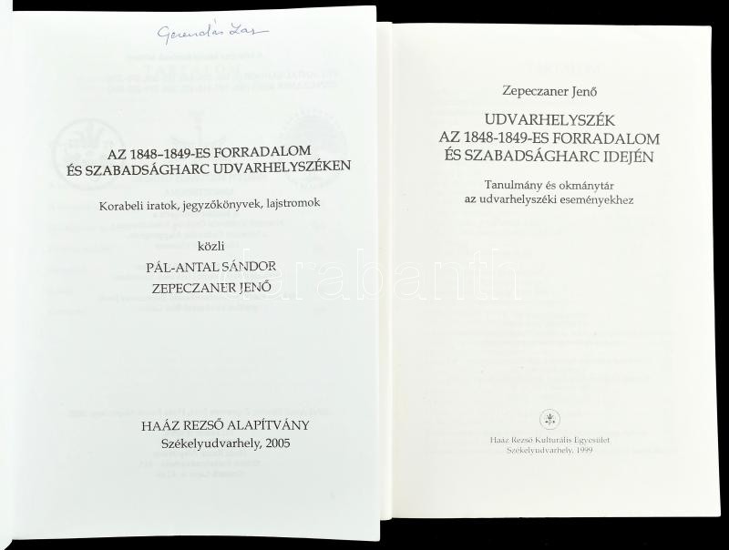Description: Udvarhelyszék az 1848-1849-es forradalom és szabadságharc idején. 1-2. köt. 1. köt.: Zepeczaner Jenő: Tanulmány és okmánytár az udvarhelyszéki eseményekhez. 2. köt.: Korabeli iratok, jegyzőkönyvek, lajstromok. Közli: Pál-Antal Sándor, Zepeczaner Jenő. Haáz Rezső Kulturális Egyesület Múzeumi füzetek 16.,24. Székelyudvarhely, 1999-2005., Haáz Rezső Kulturális Egyesület. Kiadói papírkötés.