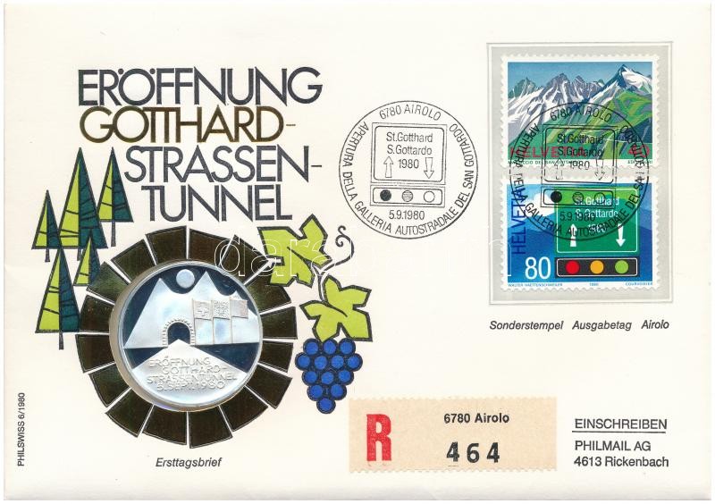 Switzerland 1980. "Eröffnung Gotthard-Strassentunnel 5. Sept. 1980" hallmarked Ag commemorative medallion in coin envelope with stamp and cancellation (0.999) C:PP