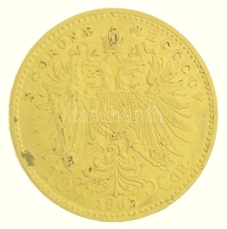https://www.darabanth.com/en/409-Online-auction/409.0/Numismatics/Gold-coins-and-commemorative-medallions~2500012/Ausztria-1905-10K-Au-Ferenc-Jozsef-3-38g0900-T2-Austria-1905-10-Corona-Au-Franz-Joseph-I~II2493159