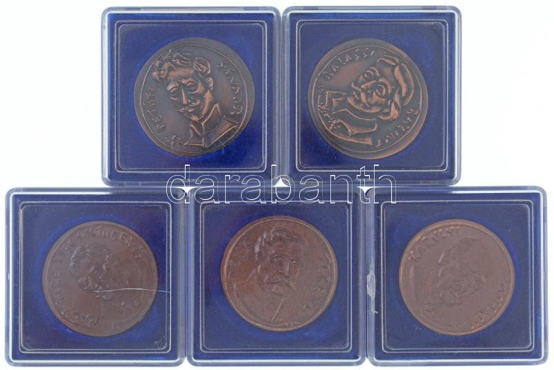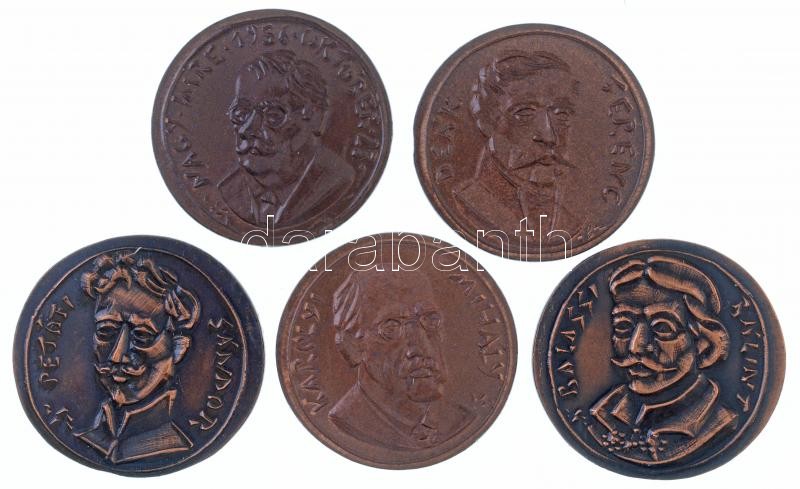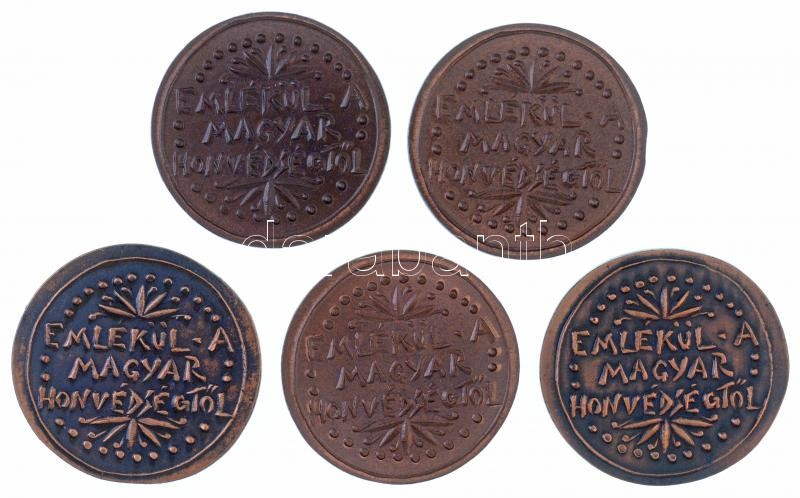Description: ifj. Szlávics László (1959-) 5db-os Cu emlékérem tétel, mindegyik hátlapján "Emlékül a Magyar Honvédségtől", az előlapokon Petőfi Sándor, Károlyi Mihály, Deák Ferenc, Nagy Imre és Balassi Bálint portréi, mind nem eredeti műanyag tokban (39mm) T:1-